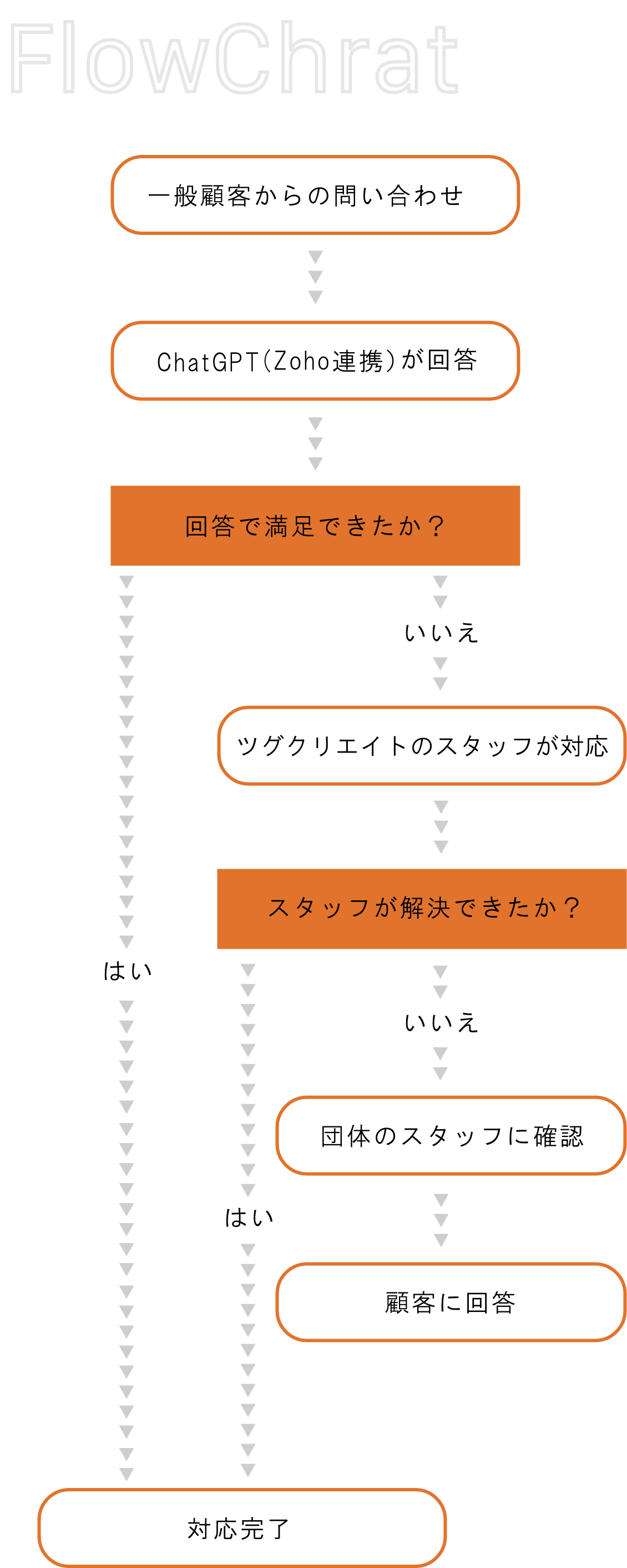ZohoとChatGPTを連携させたシステムを利用し、一般的な問い合わせには無人で対応する仕組みを導入しています。これにより、よくある質問への対応が迅速かつ効率的に行われ、ツグクリエイトのスタッフによるサポートと組み合わせることで、人手による対応の手間も大幅に減少します。